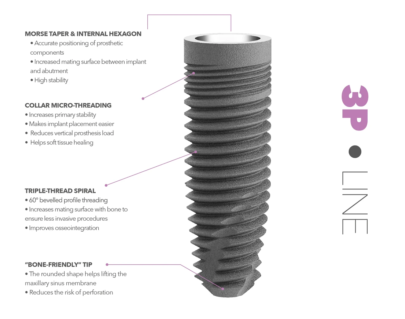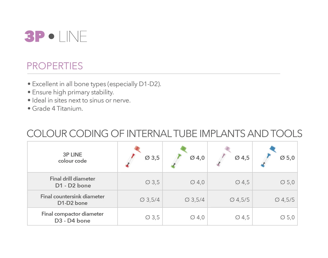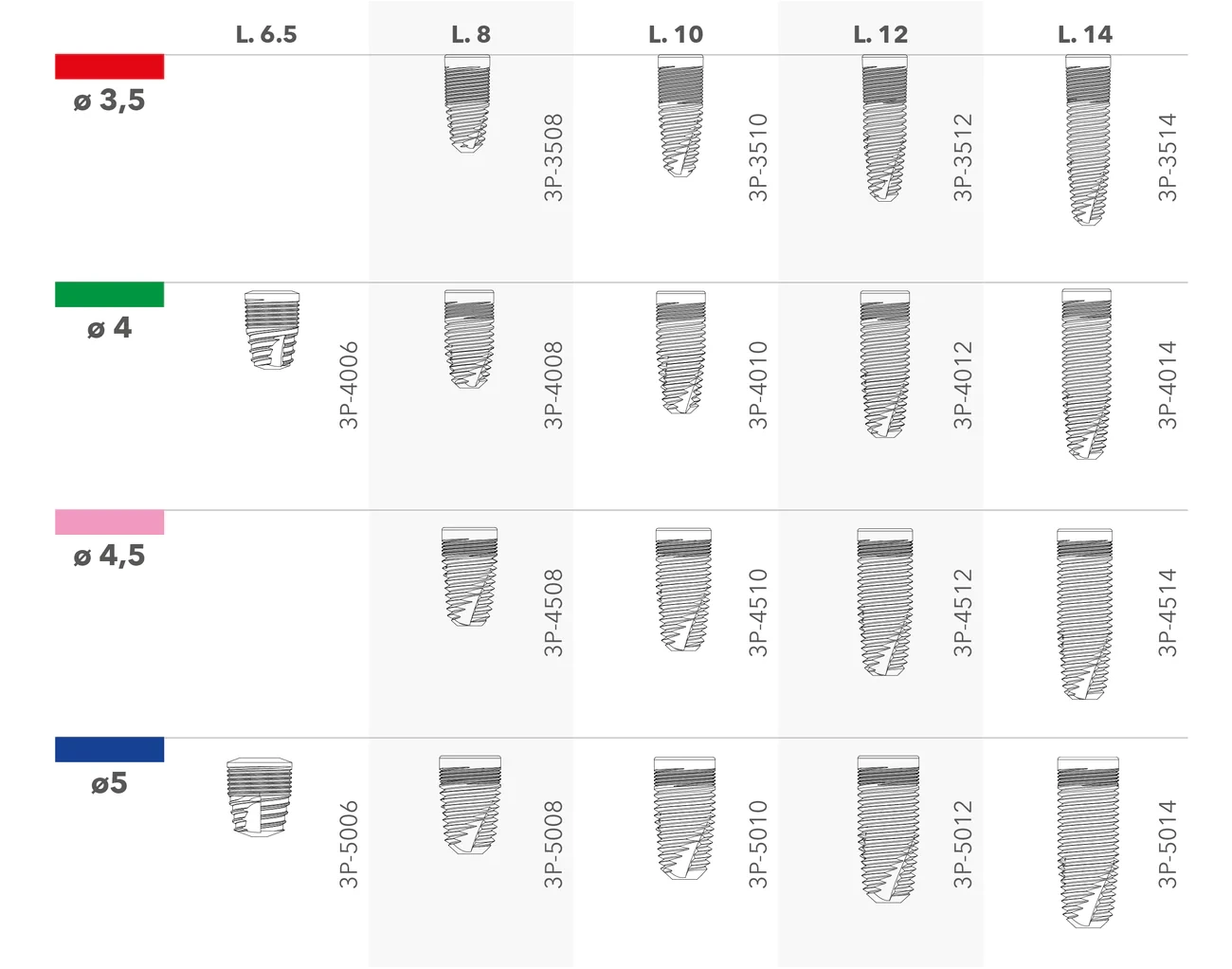 The 3P line is available in 4 diameters (3.5 – 4.0 – 4.5 – 5.0 mm) and in 5 lengths (6.5 – 8.0 – 10-12-14 mm).